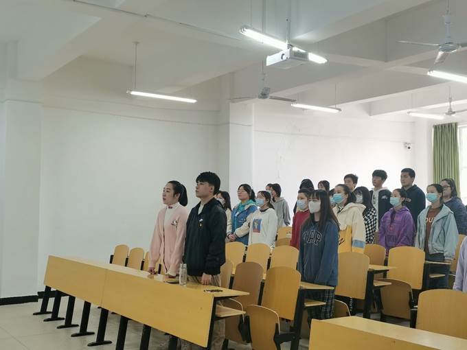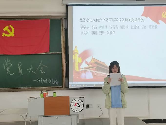 全体起立奏唱国歌之后,我支部向大会报告了对湛宇菲等12名发展对象的审查结果。随后湛宇菲等12名同志按顺序向支部大会宣读入党志愿书,汇报了自己对党的认识、入党动机、本人履历、现实表现。