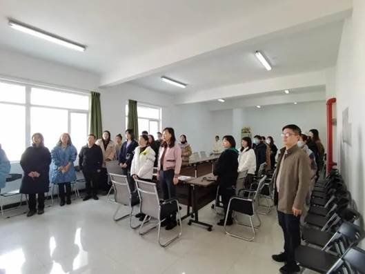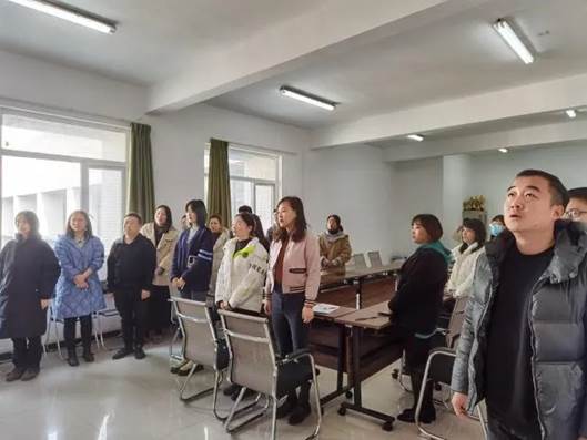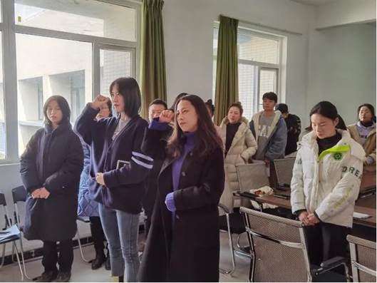 奏唱《国际歌》后,全体起立,两位新发展的党员上前向党旗致敬宣誓。全体党员重温入党誓词,字字有力、句句铿锵,宣誓了支部党员为党奋斗终生的决心。