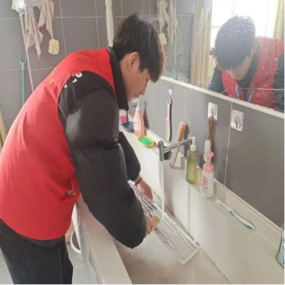 清洗过程中,志愿者们分工合作,在宿舍架起梯子,将空调的插头拔掉后将过滤网逐一拆下,在卫生间将滤网刷洗干净,擦干清洗之后再逐个装回,每个成员认真地完成各自的工作。