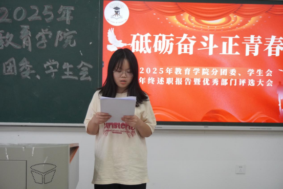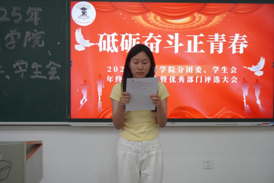 会上,各部门部长先后通过PPT展示,用详实的数据全方位回顾过去一年的工作。组织部以团务管理为核心,梳理以团员发展与评优为首的相关工作,促进各支部思想建设。宣传部详细汇报了一年来的宣传平台运营情况,介绍了宣传部主办的两场活动。秘书部统筹文秘后勤、协调会议安排,发挥了枢纽作用,保障团学内高效运转。志愿者工作部罗列了一年来的志愿活动,用行动诠释奉献、友爱、互助、进步的志愿精神。青年发展部聚焦第二课堂,为员工活动提供了制度保障,承办挑战杯院赛等赛事,丰富了在校员工的课余生活。