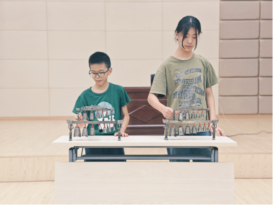 理论讲解结束后,课程进入实践环节。老师将同学们分成若干小组,每组配备了一套迷你编钟模型。在老师的示范指导下,孩子们学习了正确的小锤姿势和基本演奏技巧。随着《六口茶》欢快的旋律响起,同学们化身“小演奏家们”跟着节奏敲击编钟,清脆的钟声此起彼伏。在《茉莉花》演奏环节。有的同学们跟随音乐自发放声歌唱,用编钟伴奏,现场气氛热烈。老师逐组指导调整节奏,确保了课程体验效果。课程的最后,以《上春山》合奏将课堂气氛推向高潮,编钟在孩子们的默契配合下,以一曲动人的传统乐章结束了课程。