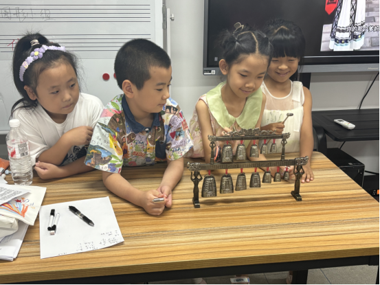 在不同社区的课堂上,教师们通常先从理论知识入手,通过生动地讲解使孩子们了解了编钟的发源地,以及编钟作为重大历史文物出土时的故事。通过展示青铜尊盘、虎坐鸟架鼓、古筝等其他古代器物图片与资料,让孩子们对灿烂的荆楚文明有了更全面的认识。随后教师播放的纪录片生动展现了编钟“一钟双音”的科学原理,教师用通俗的语言解释了这一神奇的现象,引导孩子们加深理解,领会千年前中国古人的智慧。在理论课程的最后同学们共同鉴赏了《茉莉花》《金蛇狂舞》等经典曲目的编钟演奏视频,教室里回荡着悠扬的钟磬之声。