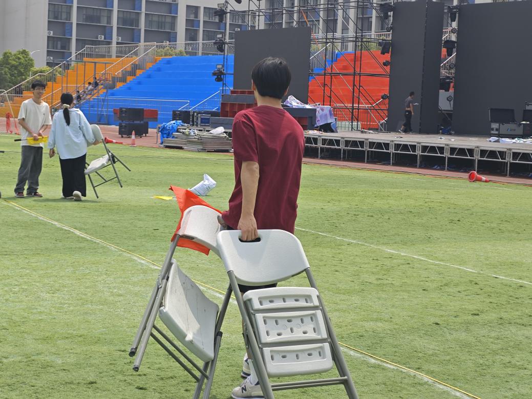4月26日正式开始现场布置工作。团队成员分布在各个岗位,如桌椅借调、现场搬运、协调分配等等。期间团队成员仍不断对各个区域进行布局上的优化,精益求精,追求完美。下午4点,文理群星颁奖晚会现场桌椅均已按计划摆放完毕,整齐的分布在操场上,场地布置工作也到此宣告结束。
