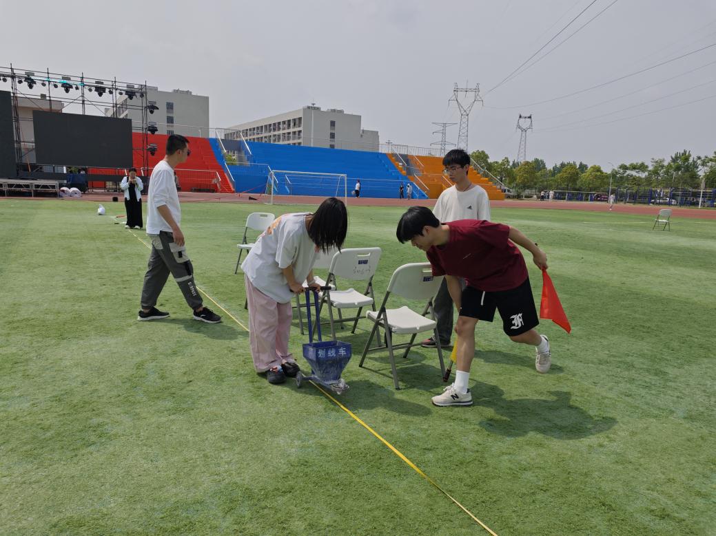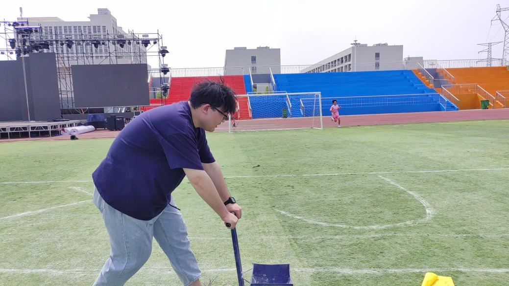 4月25日中午,团队前往田径场开始踩点,由于活动场地面积大,团队成员借助无人机定位,使用卷尺、划线车等工具反复校准边界。团队多次调整方案,既保证通道畅通、布局工整,又通过视觉设计优化观众体验,在实用性与美观性之间找到平衡点。