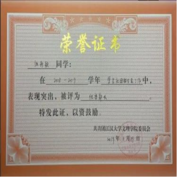 勤奋努力,在校期间成绩名列前茅,获得了一、二等奖学金,平均成绩是83.26分,平均绩点是3.01。本科期间不仅在校成绩优秀,也积极参加各种考试,获得了大量证书,如大学英语 四六级证书、普通话二级甲等证书、教团队格证(幼儿园)、湖北省翻译大赛二等奖(非专业英语B组)、全国职场英语证书等。