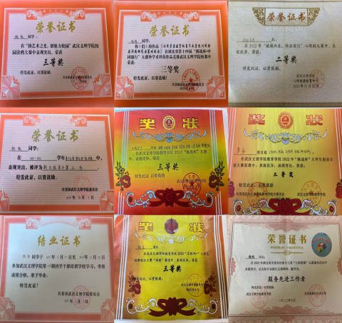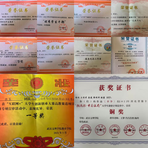 2022-2023获得一等奖学金、优秀员工干部标兵、突出才艺奖、创新创业奖、精神文明奖