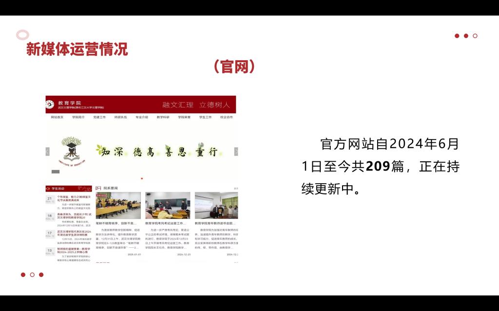 宣传部在各各平台积极宣传获得显著成果,公众号“伟德体育伟德体育官方网站”2024年6月1日至2024年11月14日共计发布公众号617篇,粉丝数达3971人。官方QQ“伟德体育伟德体育官方网站”2024年6月1日至2024年1月17日共计发布918篇,浏览量达28万人次。官方抖音“教小育”2024年6月5日至今共发布作品138篇,获赞8054,粉丝人数589,总浏览量54万。官方网站自2024年6月1日至今共209篇,正在持续更新中。