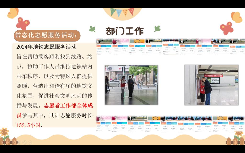 志愿者工作部积极参加各项社会服务活动,包括:与汉北社区对接的“志愿暖阳,爱心助老”志愿活动、成人自考志愿服务活动、武湖福利院志愿服务活动、长江新区社区志愿服务活动等等,同时志愿者工作部全体成员参与常态化地铁志愿服务,共计志愿服务时长152.5小时。