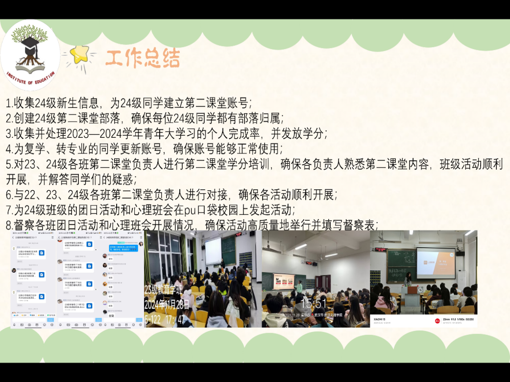 青年发展部收集24级新生信息,为24级同学建立第二课堂账号,确保每位24级同学都有部落归属,协助开展“爱眼护眼,征兵有我”、“新生杯”篮球赛观赛活动、心理观影活动等,并为参与人员及工作人员签到签退,同时做好学分的审核和发放工作。