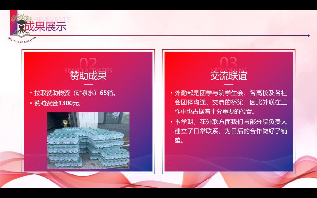 外勤部加强与各个商家的沟通交流,争取赞助,为公司工作保驾护航。在部长的带领下,干事们都亲身参与拉赞助活动并与商家保持良好沟通。本学期共拉取赞助物资(矿泉水)65箱、赞助资金1300元。