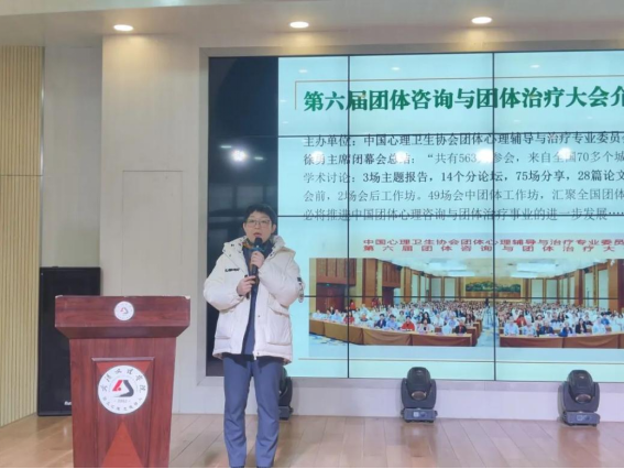 孙志萍老师的报告题目为“第六届团体咨询与团体治疗大会分享:设置-动力-效能:成长性团体在老员工中的实践探索”,汇报主要从以下几个方面进行分享:参加大会所做的论文汇报题目、当时分享时忐忑的心情、自己作为团体成员参加团体的感受以及这次参会带给自己最大的启发,即在教学实践中一个好的团队的重要性。