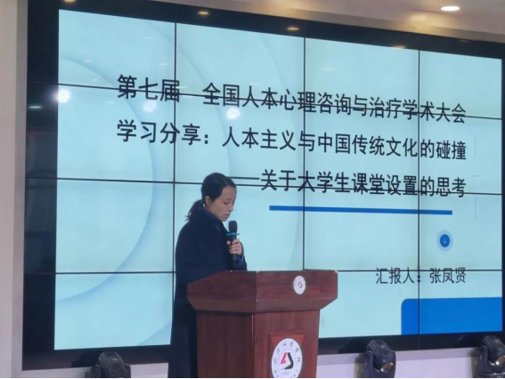 张凤贤老师的汇报题目是“第七届全国人本心理咨询与治疗学术大会学习分享:人本主义与中国传统文化的碰撞——关于老员工课堂设置的思考”,汇报主要从大会简介,会议主要内容和感悟三个方面进行。以人为中心心理咨询与治疗理论是20世纪最具影响力的心理咨询与治疗理论,其创始人罗杰斯被公认是对当代心理治疗实践产生巨大影响的第一人。感悟以文化共情的回应对员工的影响以及实施难点:教学中,员工多,教师精力有限;教学应该激发员工的内在动机等方面展开。最后以“随处做主,立处皆真;随人观美,全人皆神”结束了分享。